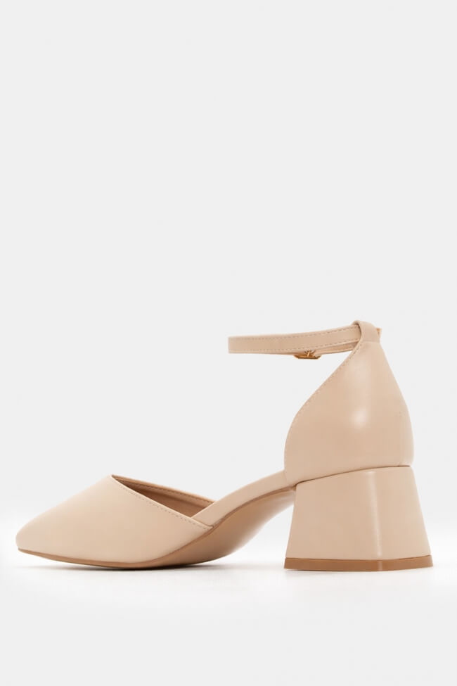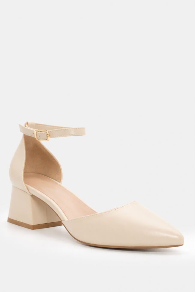 With pants: Combine the pumps with cropped pants for a modern contemporary look. The elegant cut of the pants highlights the strap detail and creates an elegant appearance.