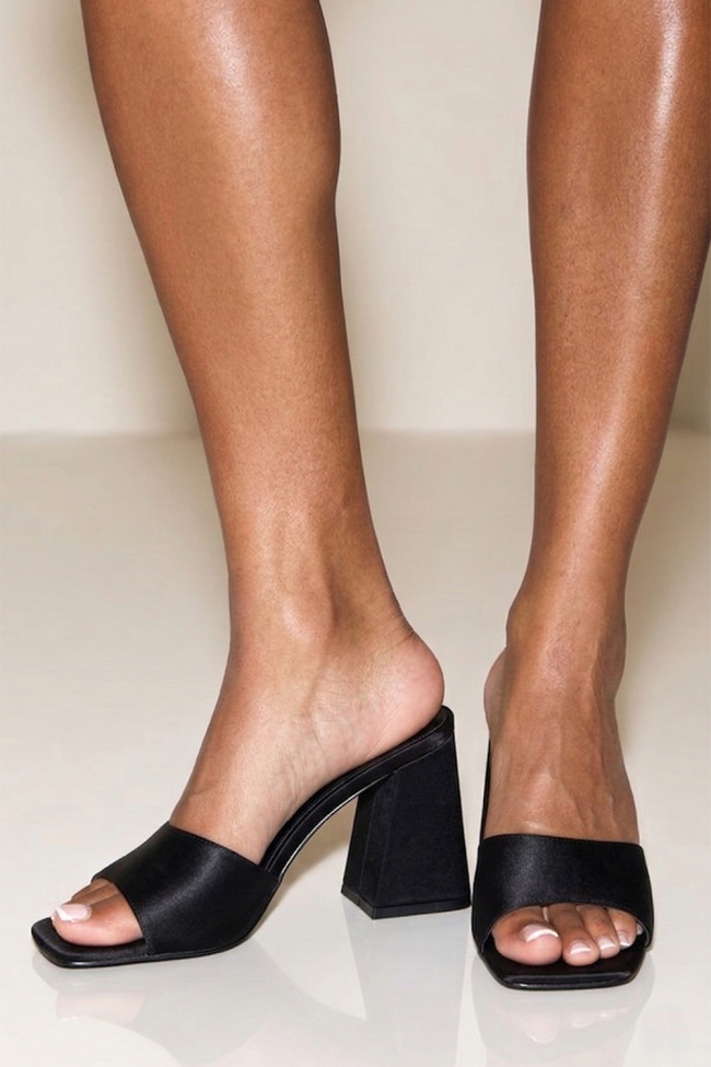 - Отворени мулета със скручена лента: Имат нещо елегантно и игриво едновременно. Скрученият лента привлича окото и добавя движение. Особено ако го съчетаете с изцяло черен външен вид, прави цялата разлика.