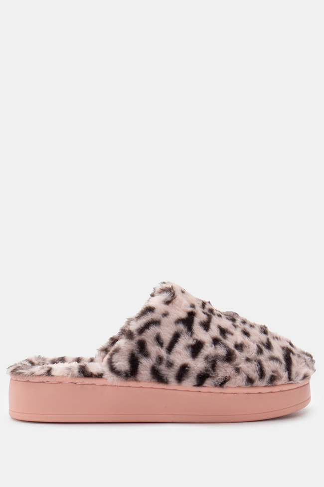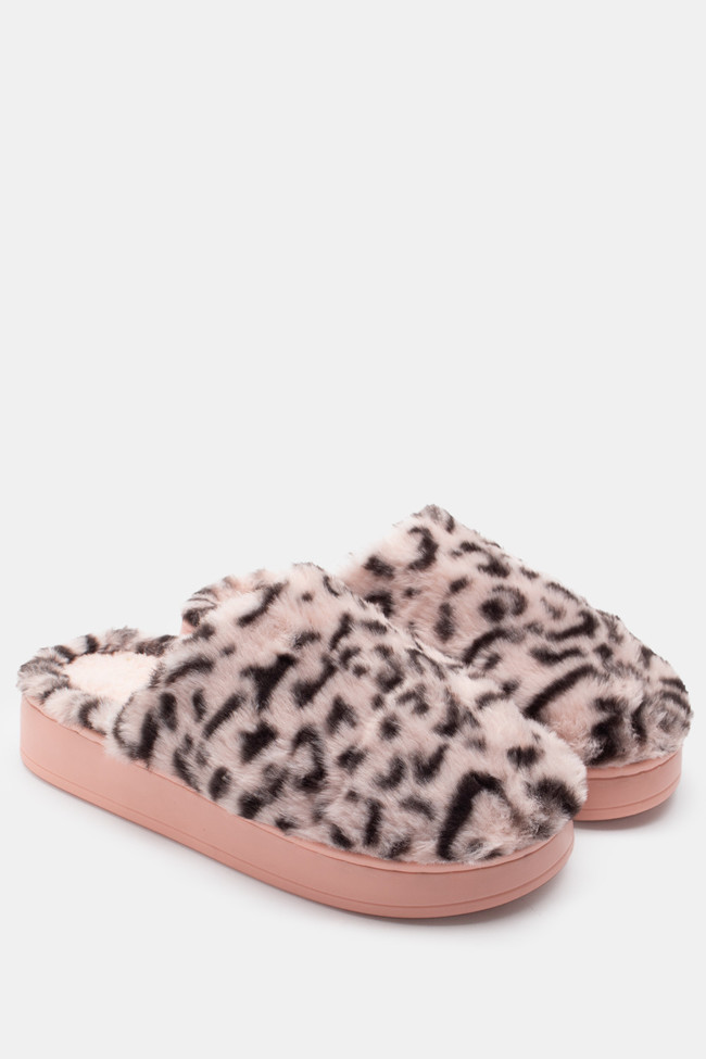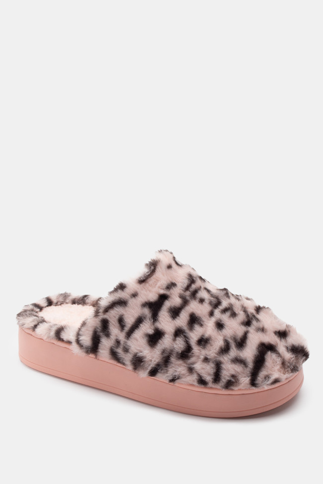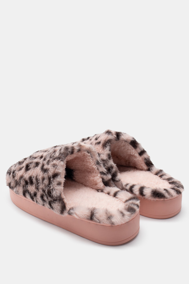 Furry Slippers with Print Detail & Criss-Cross Straps