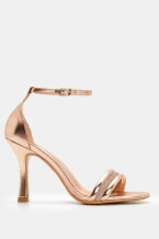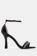 Strappy sandal, ankle buckle, decorative rhinestones, open toe, heel.