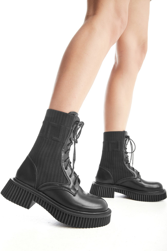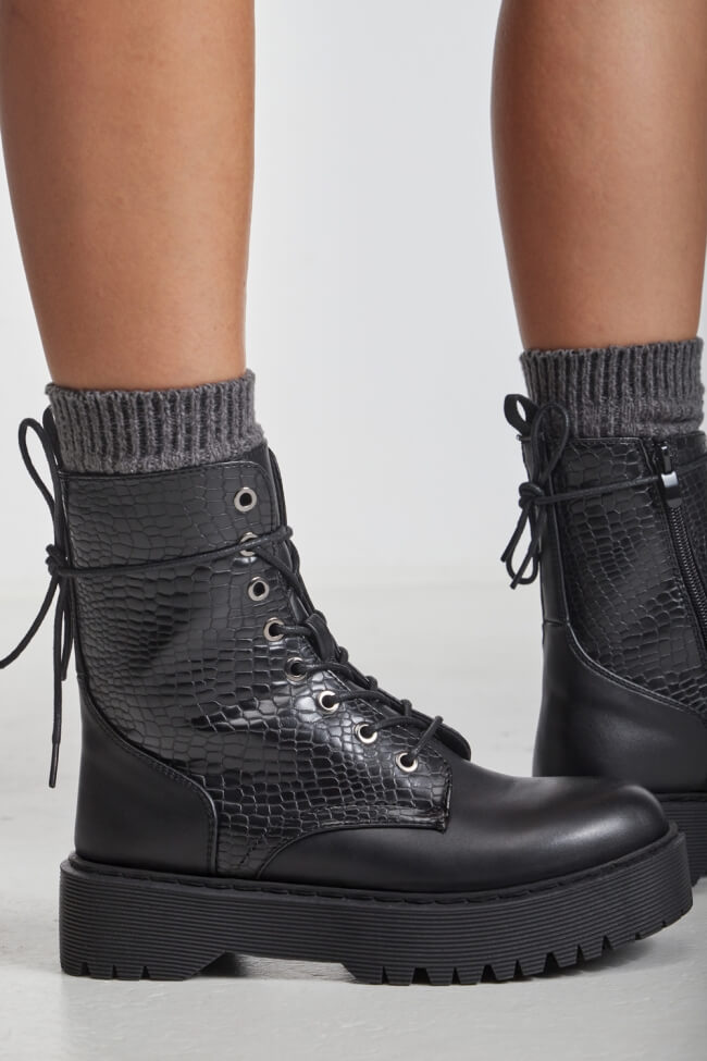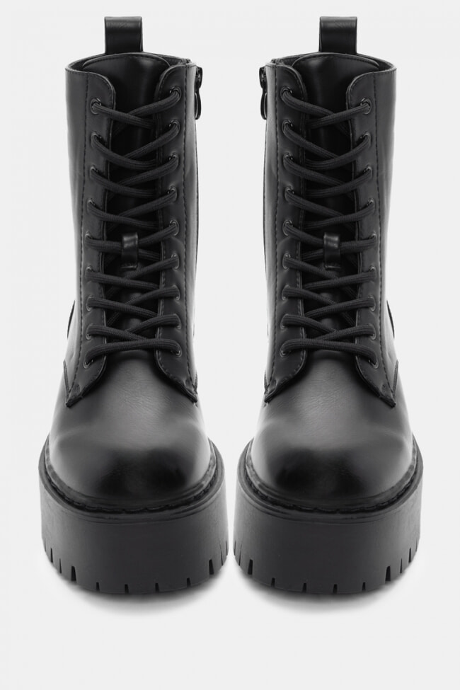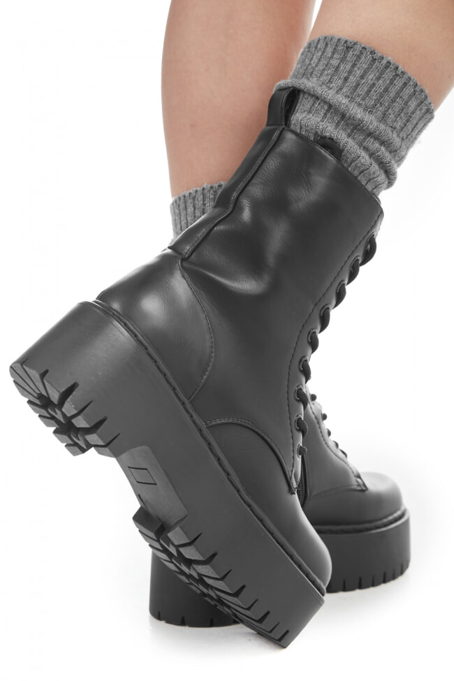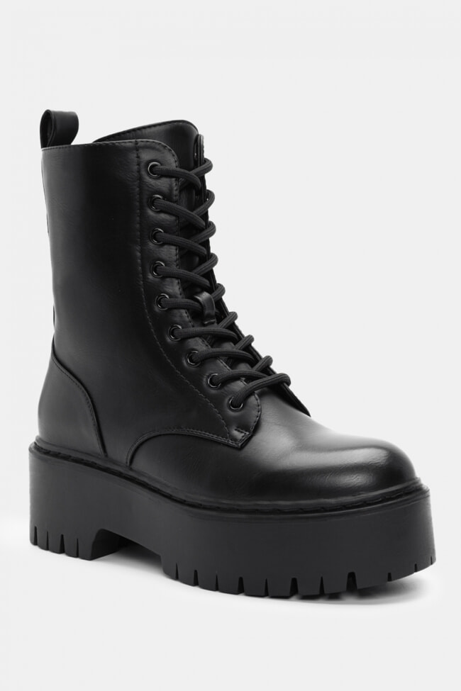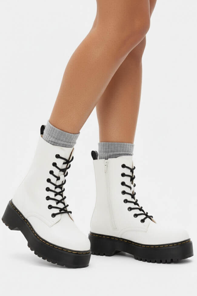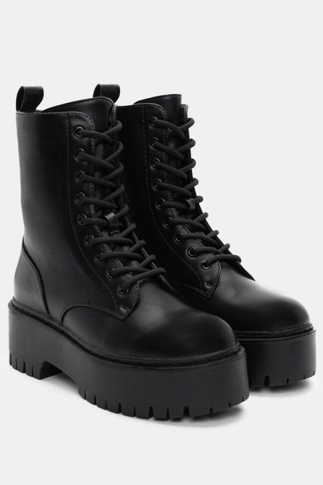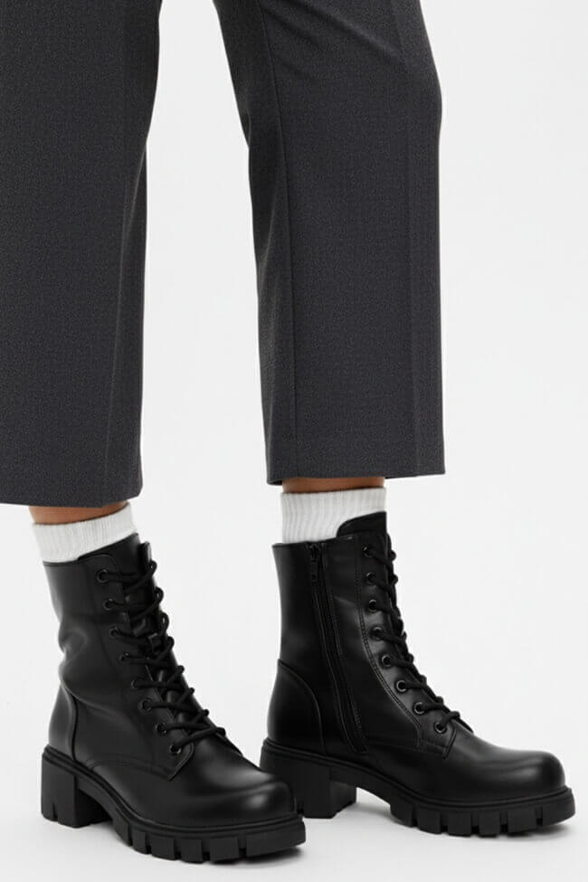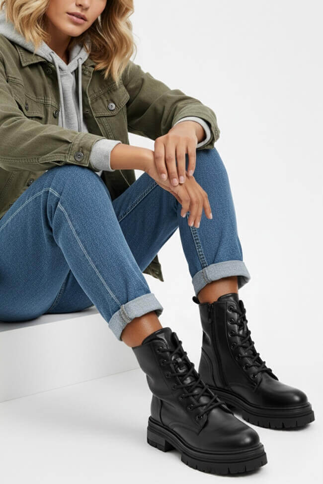 Gli stivaletti con doppia suola con suola carrarmato si accompagnano perfettamente alla culture rock e per questo sono perfetti con pezzi in pelle come gonne, leggings e giacche. Una classica giacca di pelle nera combinata con un jeans strappato è la combinazione perfetta per un look dinamico.