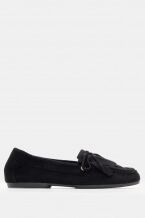 Mocassini con punta arrotondata, cuciture perimetrali e frange decorative.